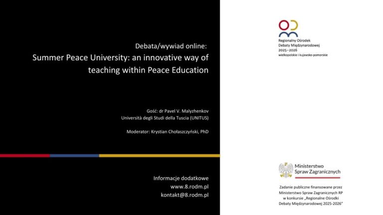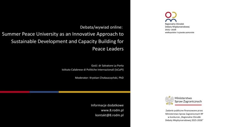 Regionalny Ośrodek Debaty Międzynarodowej w województwach wielkopolskim i kujawsko-pomorskim zorganizował wydarzenie online pt. „Summer Peace University as an Innovative Approach to Sustainable Development and Capacity Building for Peace Leaders”, poświęcone zrównoważonemu rozwojowi, edukacji na rzecz pokoju oraz kształceniu liderów międzynarodowych.