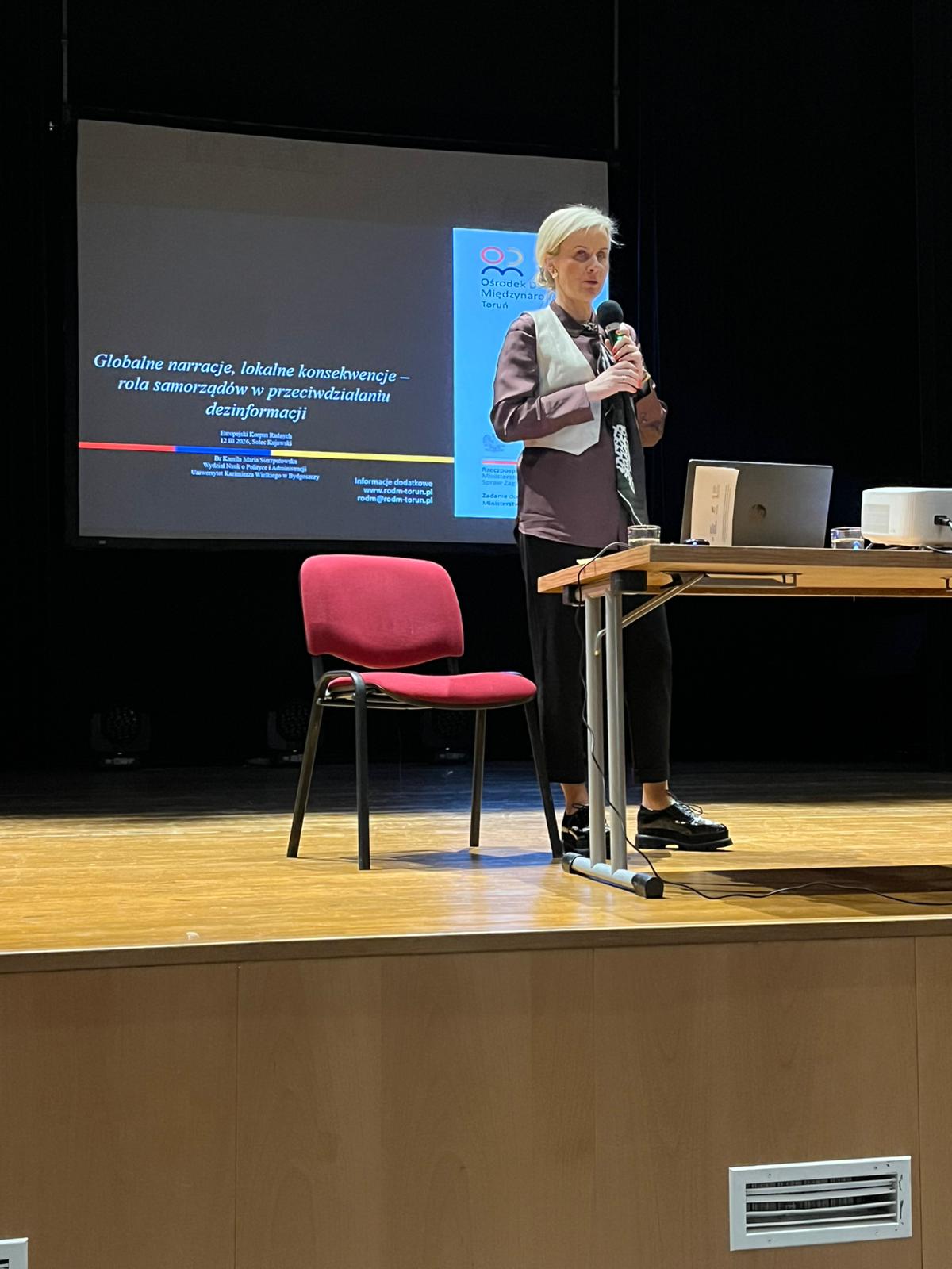 Ważną częścią spotkania był interaktywny wykład Pani dr Kamili Marii Sierzputowskiej (Katedra Systemów Politycznych i Państwa Cyfrowego, Wydział Nauk o Polityce i Administracji, Uniwersytet Kazimierza Wielkiego w Bydgoszczy, ekspert Regionalnego Ośrodka Debaty Międzynarodowej Wielkopolskie i Kujawsko-Pomorskie) pt. „Globalne narracje, lokalne konsekwencje – rola samorządów w przeciwdziałaniu dezinformacji”, który ukazywał metody walki z działaniami dezinformacyjnymi, misinformacją, ale także działaniami będącymi konsekwencją braku wiedzy, transparentności i umiejętności komunikacji między urzędnikami i innymi urzędnikami oraz mieszkańcami i administracją samorządową.