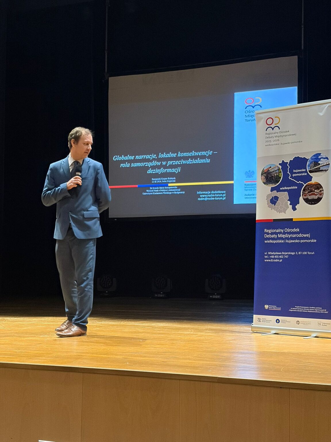 Spotkanie w Solcu Kujawskim skoncentrowane było na prezentacji: najlepszych praktyk umożliwiających rozwój miasta (Pan Adam Michalak, Burmistrz Solca Kujawskiego), form wsparcia gospodarczego realizowanych przez samorząd Województwa Kujawsko-Pomorskiego (Pan Krzysztof Rak, Zastępca Dyrektora Departamentu Rozwoju Gospodarczego Urzędu Marszałkowskiego Województwa Kujawsko-Pomorskiego w Toruniu), form wsparcia rozwoju przedsiębiorczości zapewnianych przez Kujawsko-Pomorskiego Fundusz Pożyczkowy (Pani Agnieszka Wasita, Prezesa Zarządu Kujawsko-Pomorskiego Funduszu Pożyczkowego), oferty Regionalnego Ośrodka Debaty Międzynarodowej wielkopolskie i kujawsko-pomorskie dla społeczności lokalnej oraz pracowników jednostek samorządu terytorialnego (Pan dr Piotr Sadowski, Zastępca Koordynatora Regionalnego Ośrodka Debaty Międzynarodowej wielkopolskie i kujawsko-pomorskie i Wydział Prawa i Administracji UMK), a także form pomocy oferowanych samorządom lokalnym w związku z naborem projektów na rok 2026 (Pan Krzysztof Skalski, Punkt Informacyjny Funduszy Europejskich Departament Zarządzania Funduszami Europejskimi dla Kujaw i Pomorza Urząd Marszałkowski Województwa Kujawsko-Pomorskiego w Toruniu).